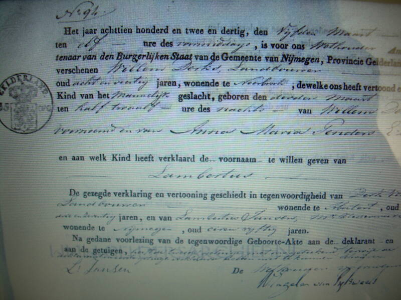 Lambertus vader heette ook LAMBERTUS DERKS. Hij was op 3 maar 1832 ter wereld gekonen. Hij was landbouwer van beroep. Hij werd in 1851 ingeschreven voor militaire dienst. Op 19 november 1863 trouwde hij in Nijmegen met Johanna Peters. Ze woonden op de Heikant in Nijmegen, ook bezat hij een hofstede in de Wolfskuil. Ze baarde zeven kinderen. Johannes Hendrikus, Hendrina Maria (werd maar drie weken oud), een levenloos geboren kind, weer een Hendrina Maria, Hendrikus Lambertus, Everdina Maria en Lambertus Petrus Wilhelmus.